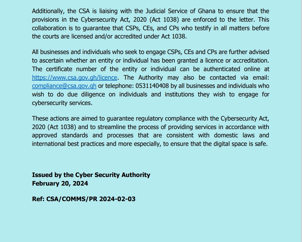 The CSA reiterated its commitment to enforcing the provisions of Act 1038, warning that individuals and businesses offering cybersecurity services without proper licensing or accreditation will face legal repercussions, including administrative penalties and criminal prosecutions.