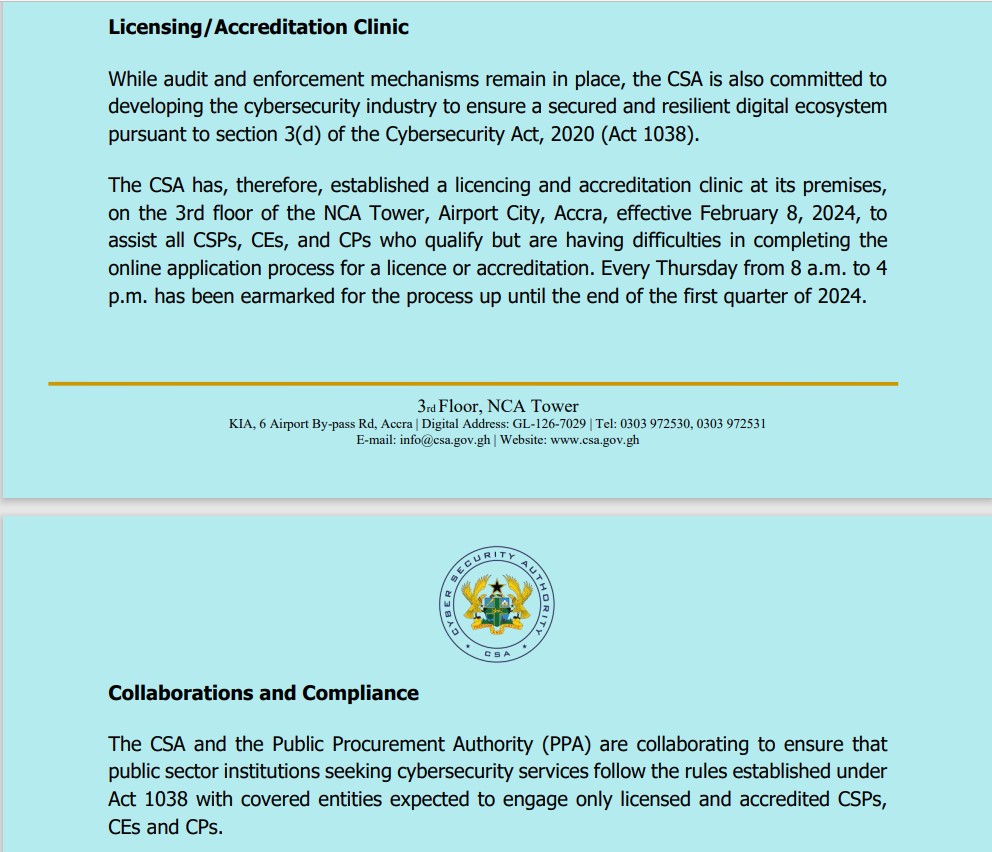 In efforts to ensure compliance across sectors, the CSA has partnered with the Public Procurement Authority (PPA) to ensure that public institutions seeking cybersecurity services engage only licensed and accredited entities. Additionally, there are collaborations with the Judicial Service of Ghana that aim to enforce Act 1038 in all relevant legal proceedings.