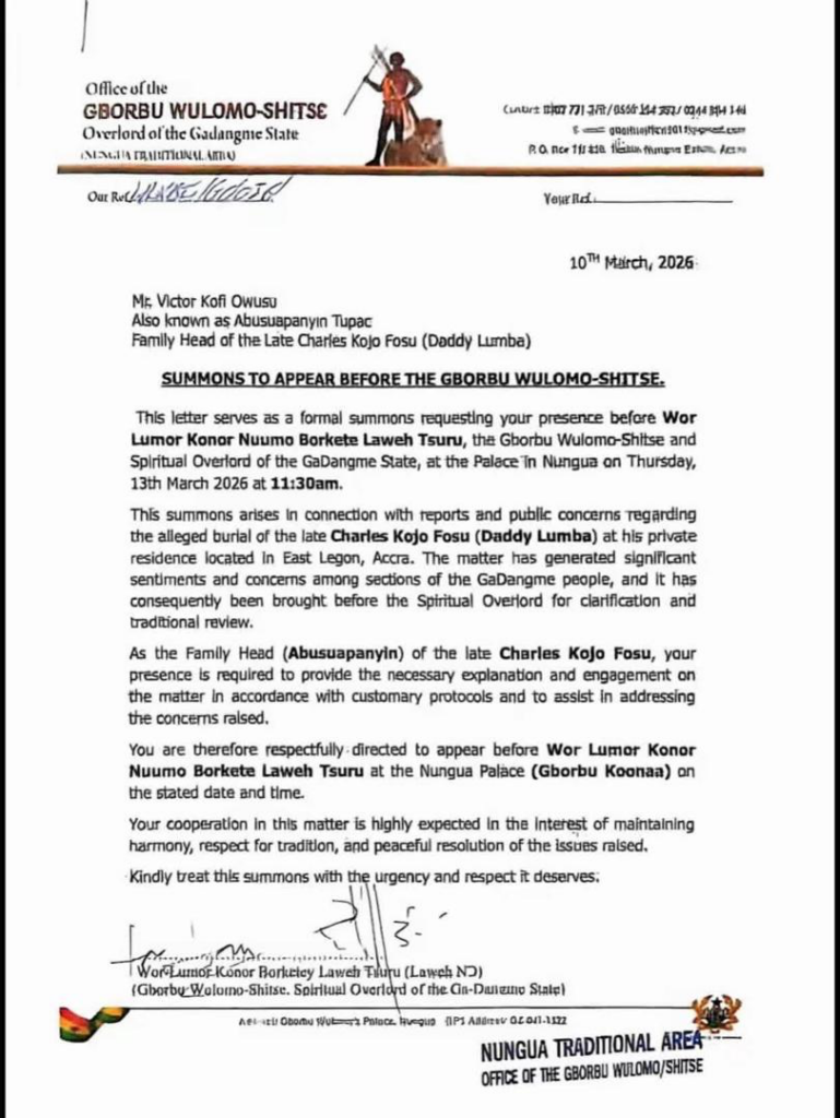The summons, issued by Wor Lumor Konor Nuumo Borkete Laweh Tsuru, the Gorbu Wulomo-Shitse and Spiritual Overlord of the GaDangme State, requests Mr Owusu to appear at the Nungua Palace on Thursday, 13th March 2026, at 11:30 am.
