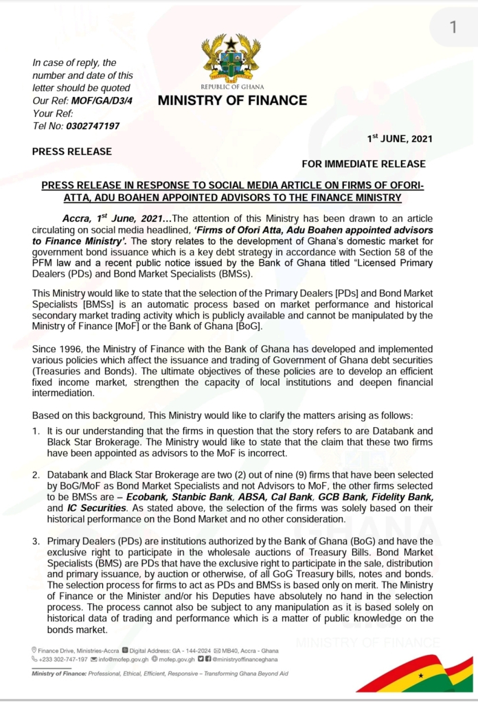 The Ministry of Finance has dismissed social media reports that Databank and Black Star Brokerage - linked to Finance Minister, Ken Ofori-Atta and the Minister of State at the Finance Ministry, Charles Adu Boahen were handpicked by the Finance Ministry and the Bank of Ghana to act as Bond Market Specialists for government bond issuance, hence benefiting from those transactions.