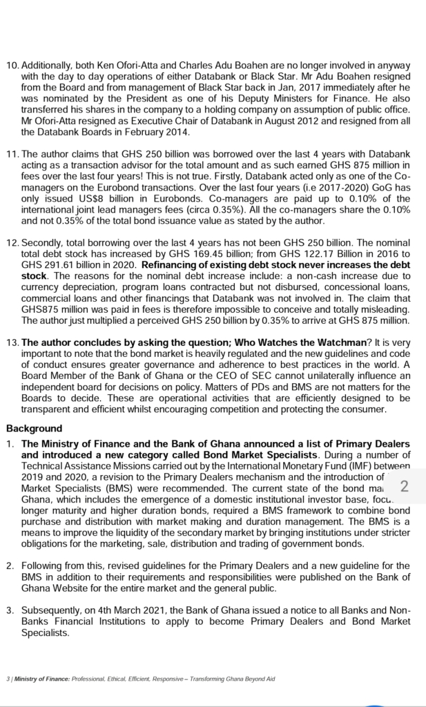 Furthermore, it pointed out that Databank and Black Star Brokerage are two out of nine firms that have been selected by BoG/MoF as Bond Market Specialists and not Advisors to MoF, adding “the other firms selected to be BMSs are – Ecobank, Stanbic Bank, ABSA, Cal Bank, GCB Bank, Fidelity Bank, and IC Securities. As stated above, the selection of the firms was solely based on their historical performance on the Bond Market and no other consideration”.