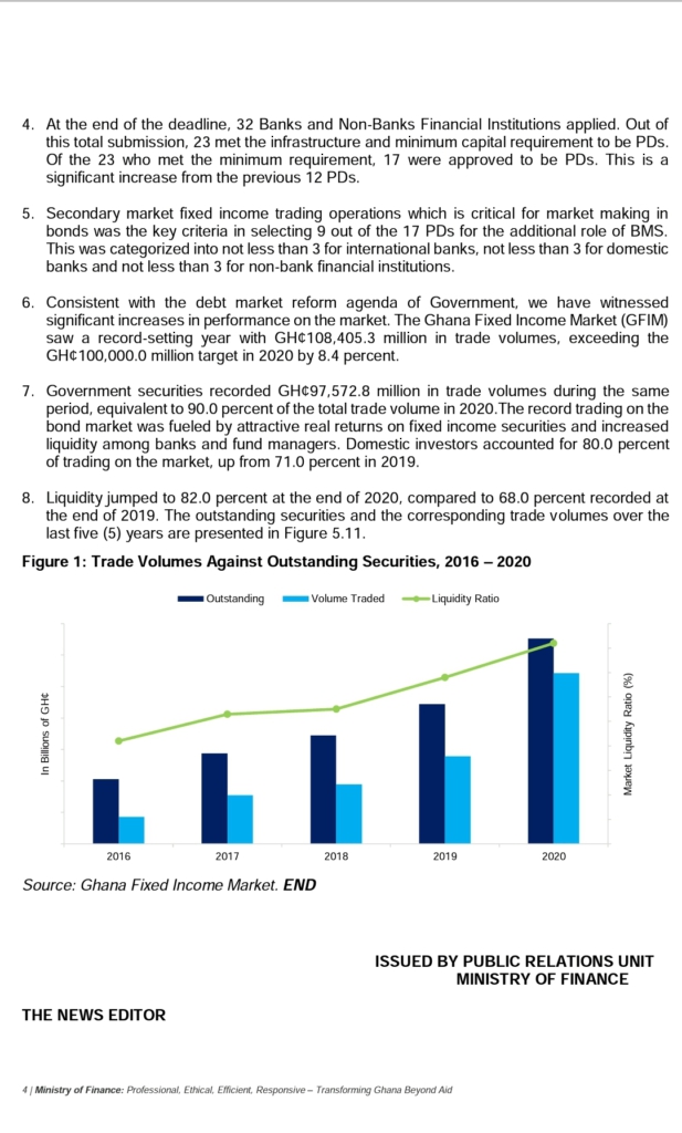 “Since 1996, the Ministry of Finance with the Bank of Ghana has developed and implemented various policies which affect the issuance and trading of Government of Ghana debt securities (Treasuries and Bonds). The ultimate objectives of these policies are to develop an efficient fixed income market, strengthen the capacity of local institutions and deepen financial intermediation”, it added.