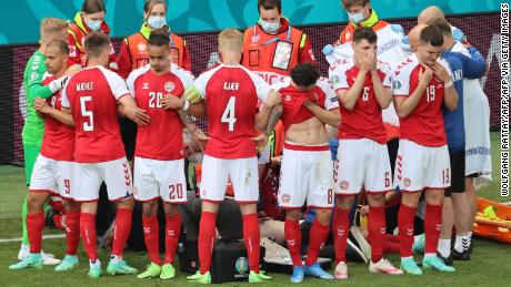 Some members of the Danish team formed a phalanx around the player as medics worked to resuscitate him while goalkeeper Kasper Schmeichel and defender Simon Kjær moved to console Eriksen's wife who was moving towards the scene from the stands.