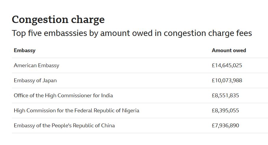 The US Embassy owes the largest amount at almost £14m, the Embassy of Japan owes over £10.1m and meanwhile Togo owes £40.