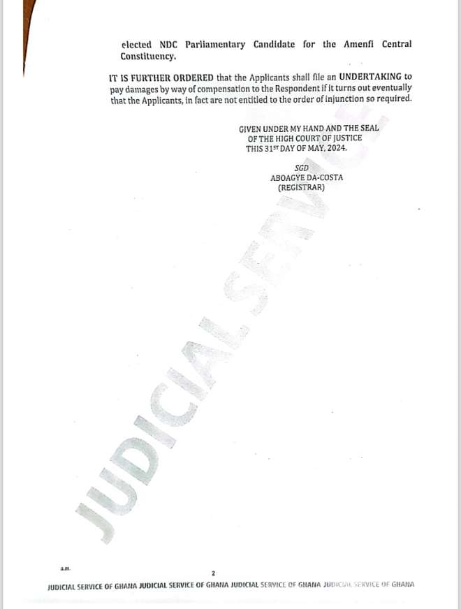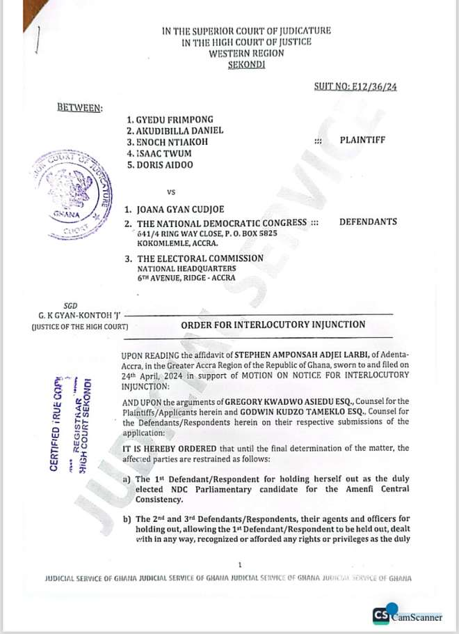 In a ruling on May 31, Justice G.K Gyan-Kontoh granted an interlocutory injunction restraining Ms. Cudjoe "from holding herself out as the duly elected NDC Parliamentary candidate for the Amenfi Central Constituency" until the court makes a final determination in a case against her.