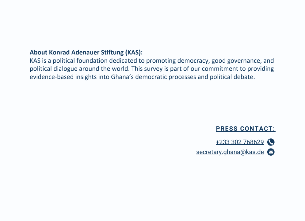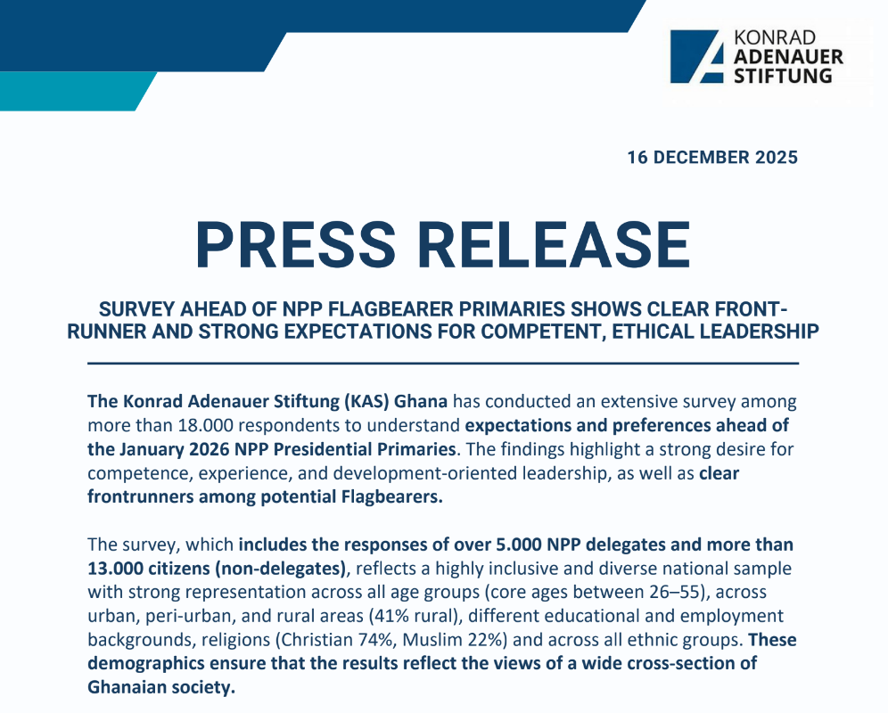 According to Konrad Adenauer Stiftung Ghana, the survey included responses from over 5,000 NPP delegates and more than 13,000 citizens (non-delegates). The organisation said this reflects a highly inclusive and diverse national sample, with strong representation across all age groups, particularly those aged 26 to 55, and across urban, peri-urban and rural areas, with 41 per cent of respondents from rural communities.