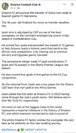 Ghana Premier League side Dreams FC have confirmed the departure of youngster Abdul Aziz Issah to Barcelona.