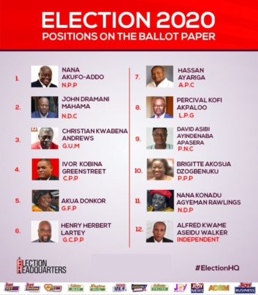 They are; Alfred Walker; an independent candidate, President Akufo-Addo of the New Patriotic Party (NPP), Christian Andrews; The Ghana Union Movement (GUM), Brigitte Dzogbenuku; People’s Progressive Party (PPP), John Dramani Mahama; National Democratic Congress (NDC).