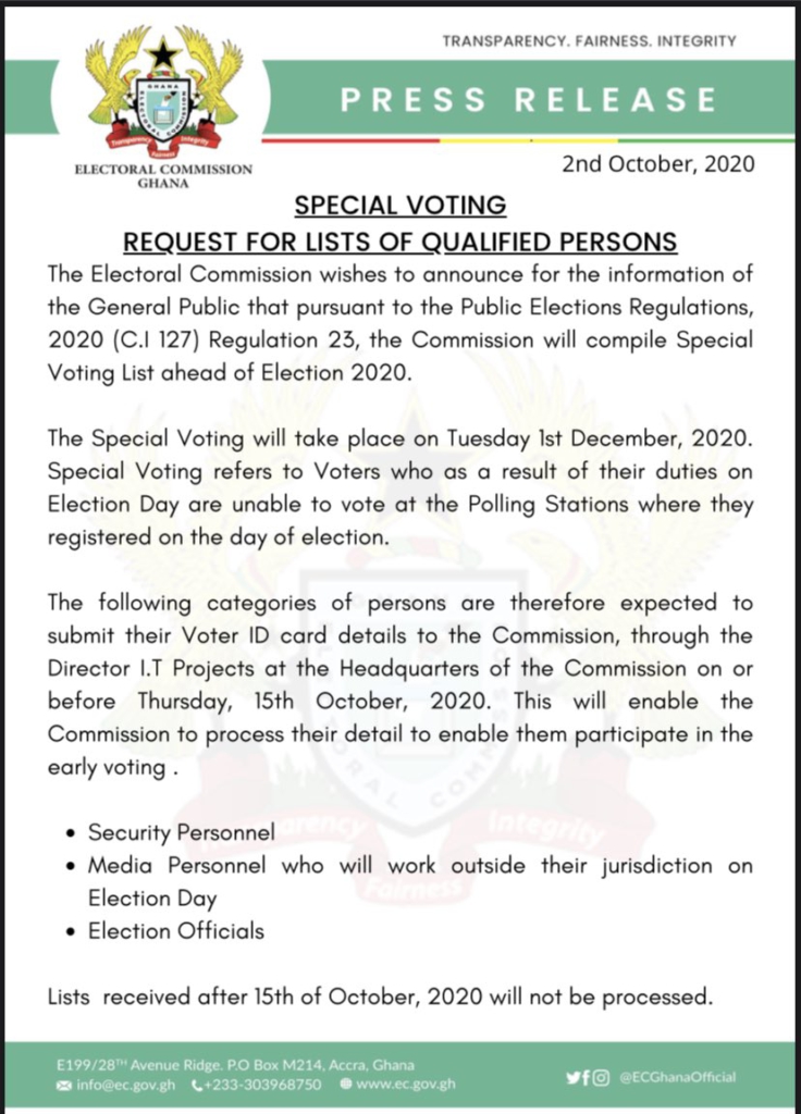 The Electoral Commission (EC) has slated Special Voting for the 2020 general elections for Tuesday, December 1, 2020.