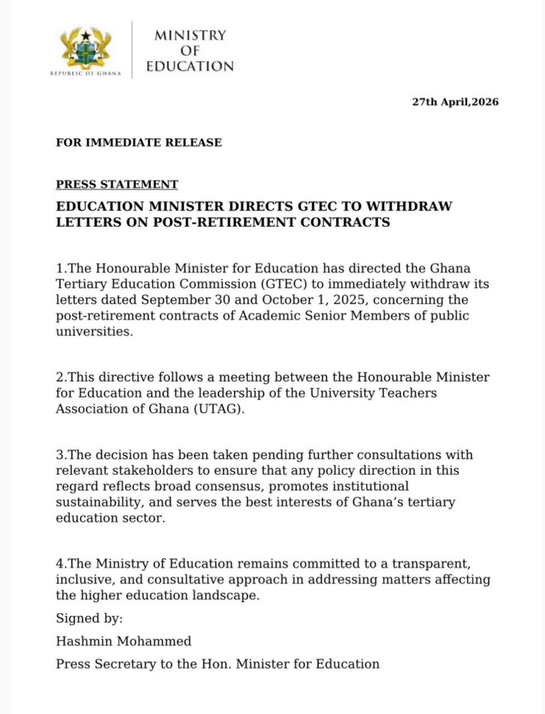 “The Honourable Minister for Education has directed the Ghana Tertiary Education Commission (GTEC) to immediately withdraw its letters… concerning the post-retirement contracts of Academic Senior Members of public universities,” the statement said.