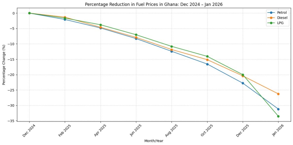 I’ve noticed yet again announcements by major Oil Marketing Companies (OMCs) for further fuel price reductions in the second pricing window of January 2026. Looking back to December 2024, petrol was averaging over GH¢14 per litre, diesel above GH¢15, and LPG near GH¢18–19 per kilogram. Today, petrol is approaching GH¢9.97–9.99 in some stations, with diesel and LPG also significantly lower, providing much-needed relief for ordinary Ghanaians.