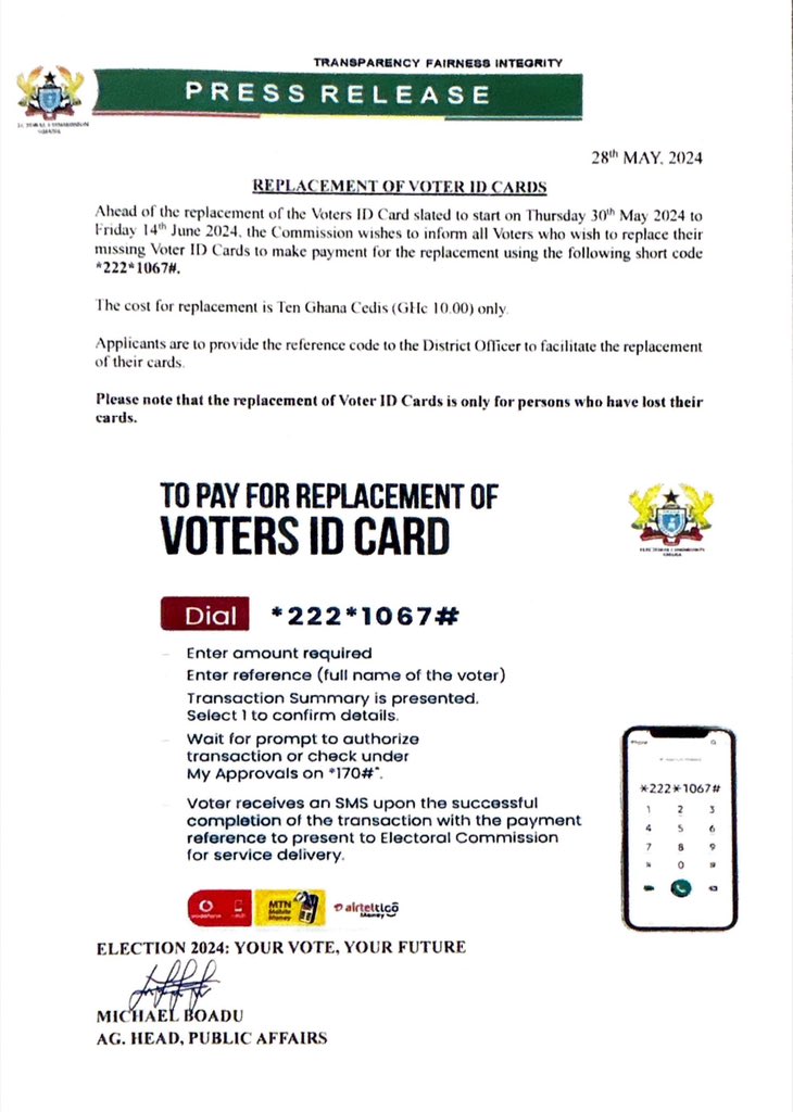 The Electoral Commission (EC) has officially declared the commencement of the replacement process for Voter ID Cards, beginning today, Thursday, May 30, and extending until Friday, June 14, 2024.
