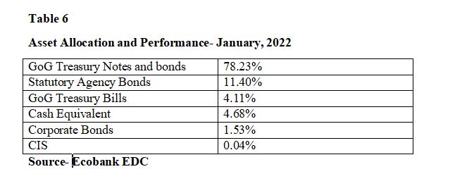 It is clear that individuals will not be affected by the debt exchange programme but individuals have invested in fund management companies like the Ecobank EDC, Databank etc that have invested in government bonds. Using Ecobank EDC as an example, it has the largest fund size in Ghana. As at, 28th August, 2022, it had ¢ 2.663 billion under management. Already, fund managers are paying investors marked-to-market value instead of amortized value which is eroding interest and principal. In fact, individual and institutional investors will be affected by GDEP. Table 6 below is the asset allocation and performance for Ecobank EDC as of January, 2022.