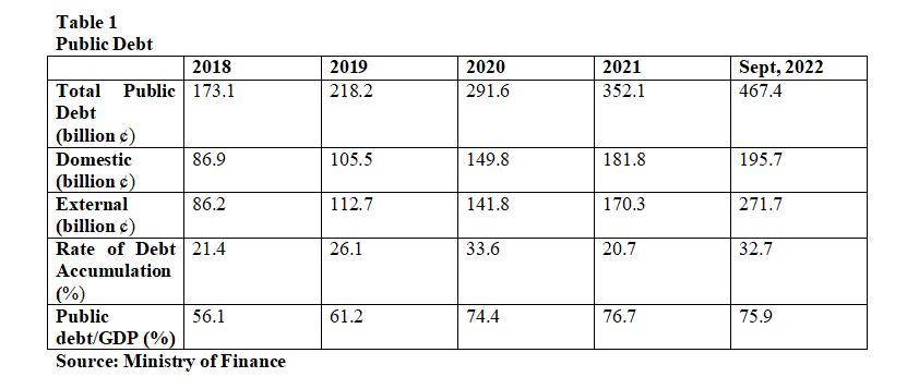 According to the 2023 Budget, the total gross public debt amounted to GH¢467,371.32 million (US$48,871.34 million) at end-September 2022, equivalent to 75.9 per cent of GDP. This compares to end-December 2021 total gross public debt of GH¢352,086.98 million (US$58,689.97 million), representing 76.7 per cent of GDP.