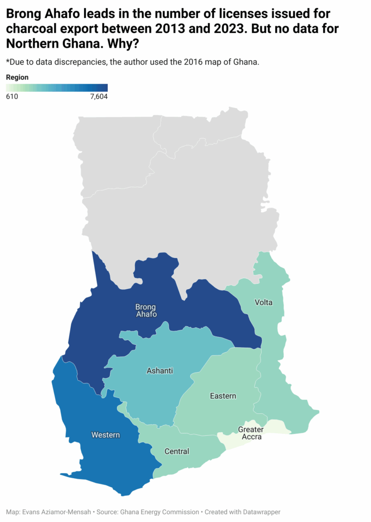While northern Ghana is seeing a booming informal charcoal trade, official data shows that the Brong Ahafo Region holds the highest number of export licenses over the past ten years. Between 2013 and 2023, the Energy Commission licensed 7,604 tons of charcoal exports from Brong Ahafo. This figure represents almost one-third of the 24,512 tons of charcoal licensed for production exported from Ghana within the same period.
