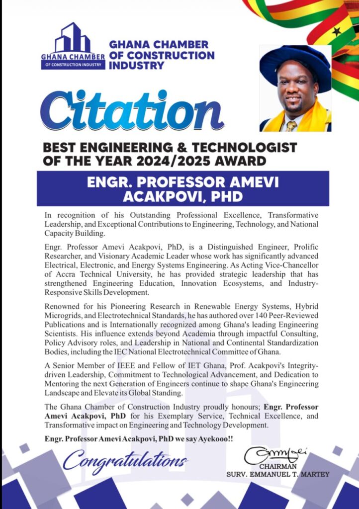 The Ghana Chamber of Construction Industry (GCCI) has awarded Engr. Professor Amevi Acakpovi, PhD, the Best Engineering & Technologist of the Year 2024/2025 Award, in recognition of his exceptional professional excellence, transformative leadership, and outstanding contributions to engineering, technology, and national capacity building.