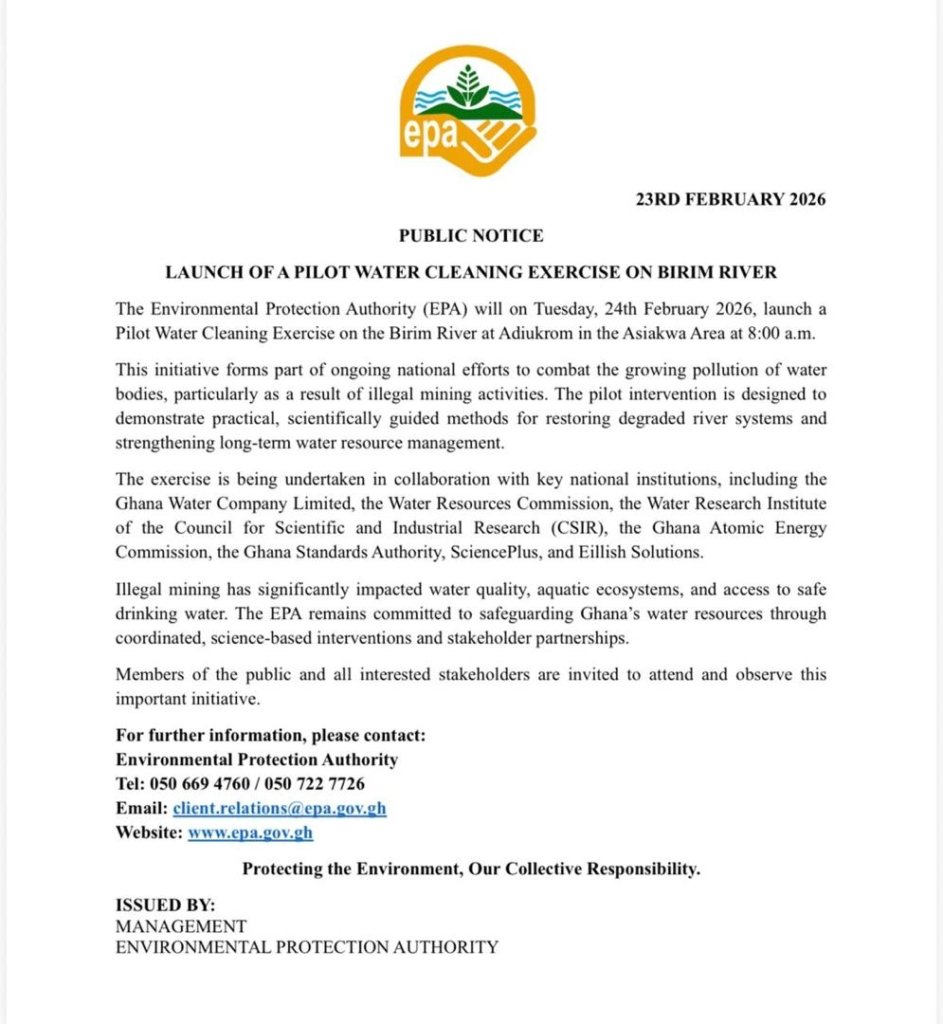 The Environmental Protection Authority (EPA) is set to commence a pilot clean-up operation on the Birim River at Adiukrom in the Asiakwa area on Tuesday, February 24.