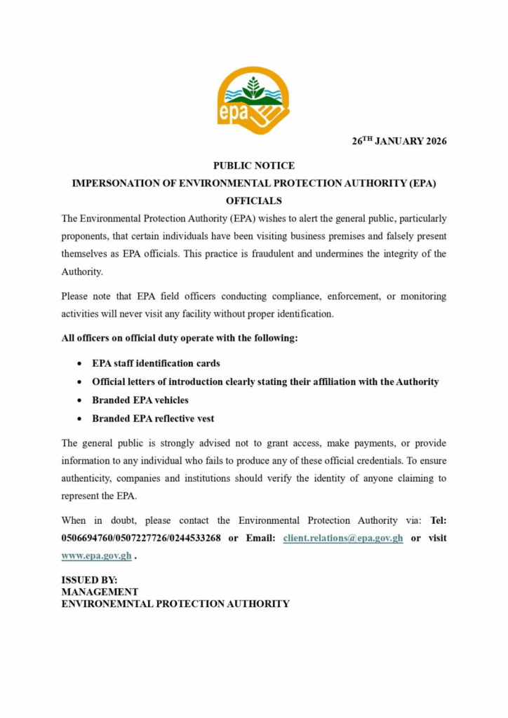 To help the public confirm the authenticity of EPA officials, the Authority urged organisations and individuals to contact its offices whenever there is doubt.