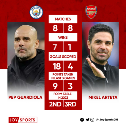 Going into Wednesday's showdown between the two, Arsenal lead in first place with 75 points, while Man City trail on 70 points but with two games in hand. Arsenal are stuttering after three straight consecutive draws, the latest in a dramatic 3-3 comeback against last-place Southampton, leaving the door open for Man City in the title race.