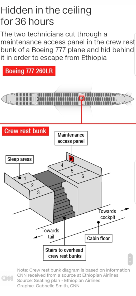 They had concealed themselves in the ceiling space above the seating, according to a source at Ethiopian Airlines with firsthand knowledge of the internal investigation that was launched afterward.