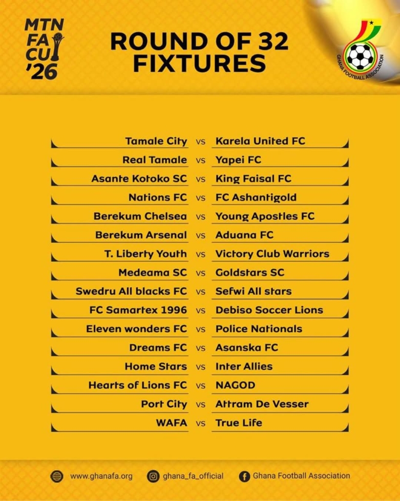 Other Round of 32 fixtures kick off on Wednesday, December 31, 2025, with Swedru All Blacks taking on Sefwi All Stars at the Swedru Park, and FC Samartex 1996 facing Debiso Soccer Lions FC.