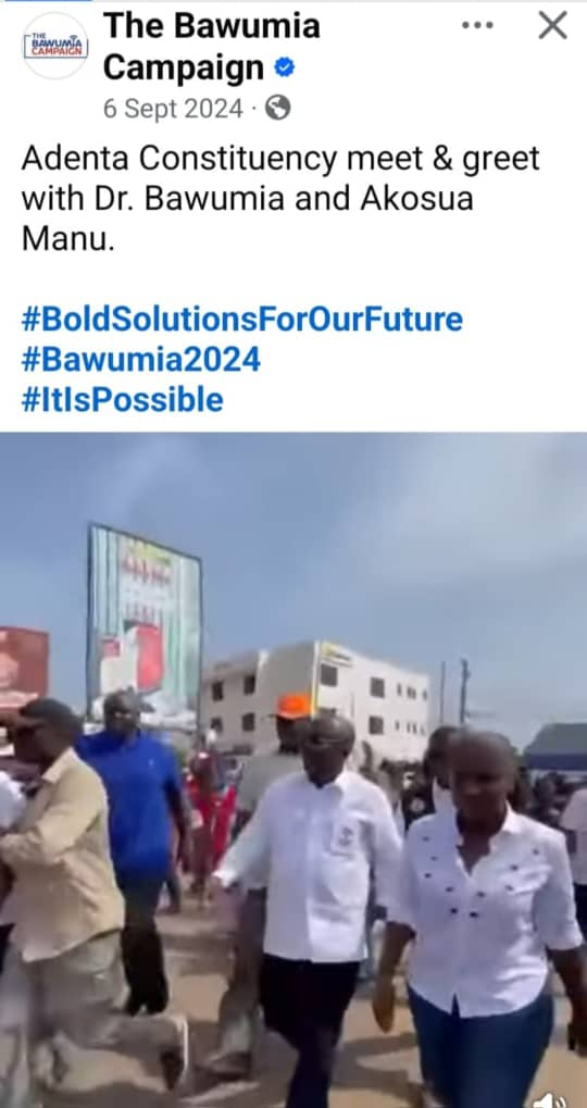 Dr Bawumia was present in Adenta on November 27, 2020, to campaign for Yaw Buaben Asamoah, and again on September 6, 2024, to campaign for Akosua Manu as well as for his own presidential bid.