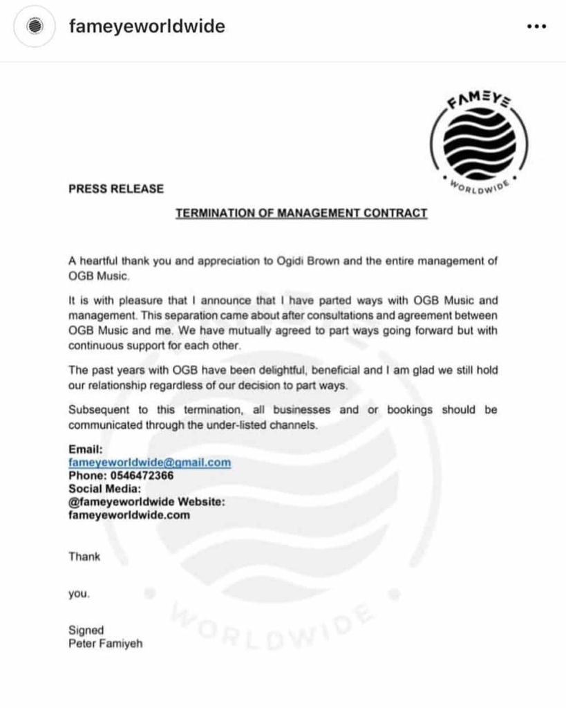 Meanwhile, in the press release, Fameye stated he was thankful and appreciative to Ogidi Brown and the entire management of OGB Music.