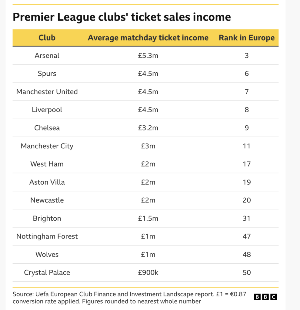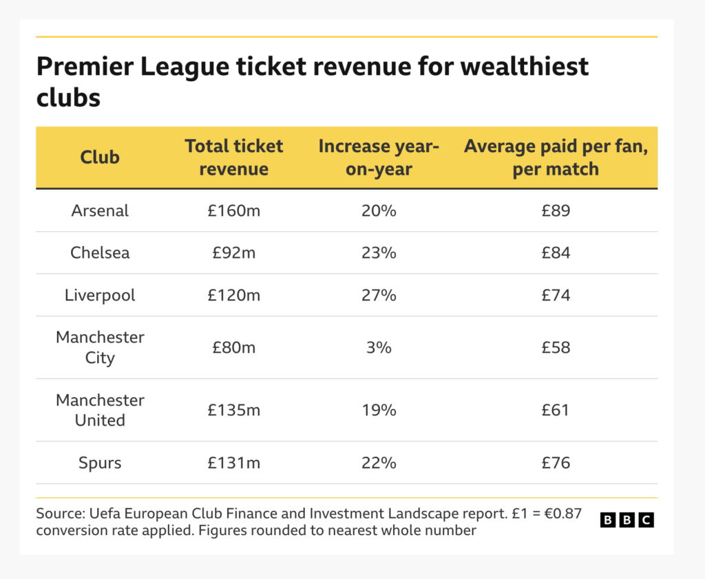 The UEFA European club finance and investment landscape report shows that Arsenal, Chelsea, Liverpool, Manchester City, Manchester United and Tottenham earned an average of 19% more from ticket sales for home matches in 2025 than in 2024.