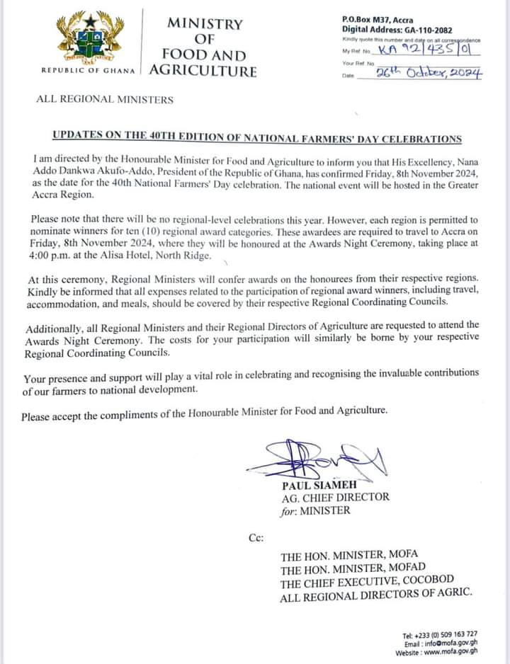 The Agriculture Ministry has announced that the 40th edition of Ghana's National Farmers' Day will be celebrated on Friday, November 8, 2024.