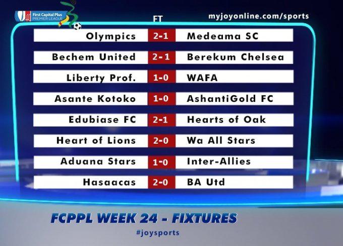 Matchday 24 recorded 15 goals with Ashantigold's lead at the top maintained despite their defeat at the hands of Kotoko. Hearts of Oak suffered their second successive away defeat after falling to a late goal to New Edubiase.