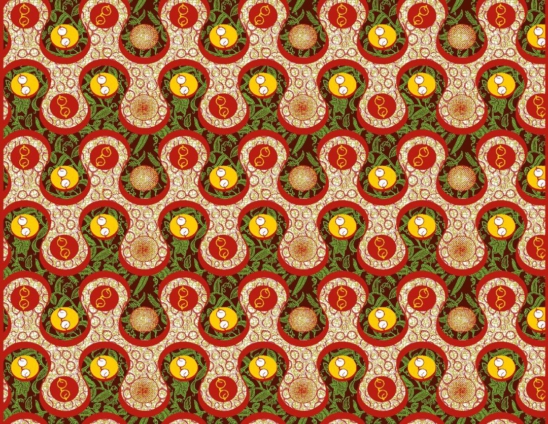 Depending on angle of view, both are either breaking free or imprisoned, surrounded either by miniature round glasses or leaves.