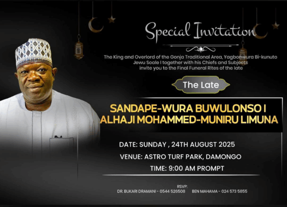 The final funeral rites for the late, Acting Deputy National Security Coordinator, Alhaji Limuna Mohammed Muniru will take place today, Sunday, August 24, in Damongo.