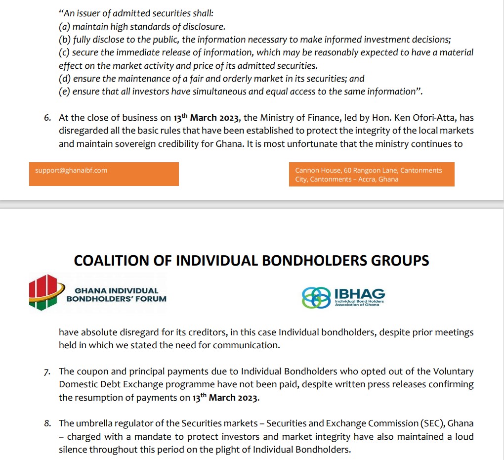 “The umbrella regulator of the Securities markets – Securities and Exchange Commission (SEC), Ghana – charged with a mandate to protect investors and market integrity have also maintained a loud silence throughout this period on the plight of Individual Bondholders. The Ghana Fixed Income Market of the Ghana Stock Exchange, where the old Government of Ghana bonds are listed and traded have also not enforced its basic rules of disclosure required by issuers. More loud silence.”