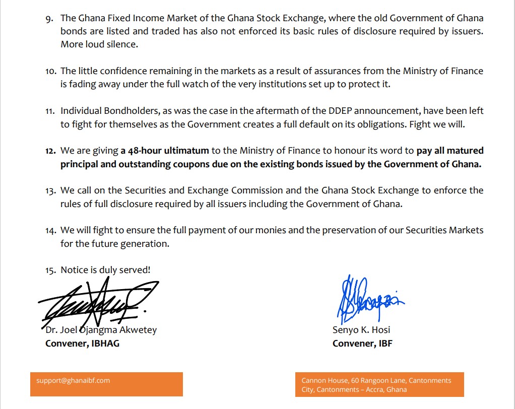“We are giving a 48-hour ultimatum to the Ministry of Finance to honour its word to pay all matured principal and outstanding coupons due on the existing bonds issued by the Government of Ghana. We call on the Securities and Exchange Commission and the Ghana Stock Exchange to enforce the rules of full disclosure required by all issuers including the Government of Ghana”.
