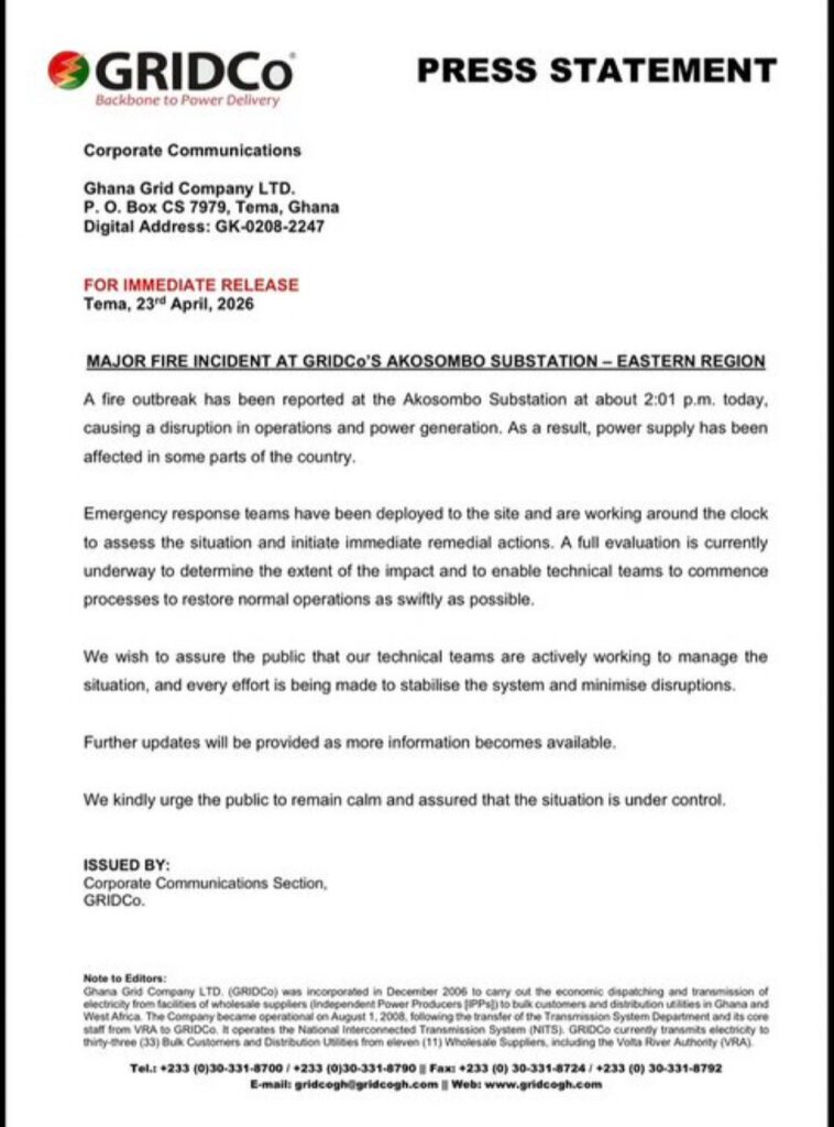 The Ghana Grid Company Limited has announced that a fire outbreak at the Akosombo Substation has disrupted operations and affected electricity supply in parts of the country.