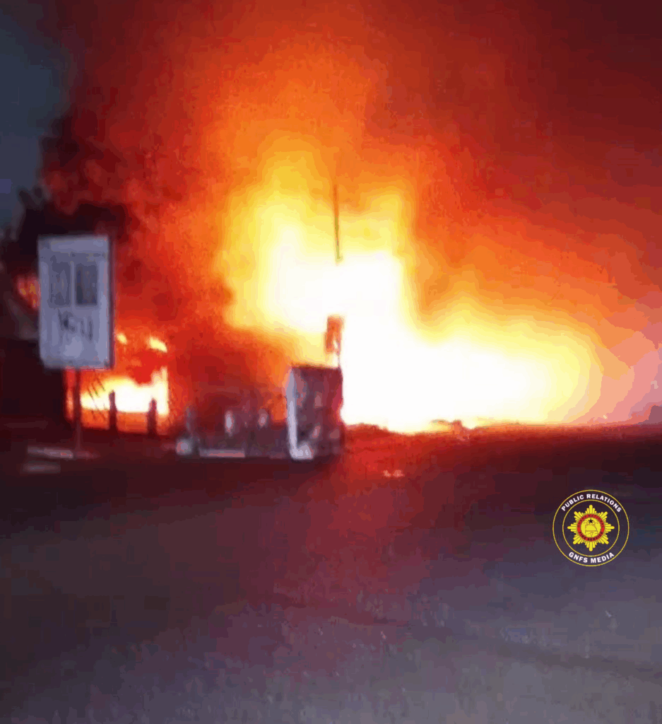 A ferocious fire swept through a row of metal container shops along Spintex Road near Marina Mall in the early hours of Saturday, February 7, 2026, destroying several businesses but narrowly avoiding a major catastrophe, following a coordinated response by the Ghana National Fire Service (GNFS).