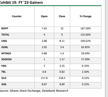 Benso Oil Palm Plantation (GH¢22.00, 187.58%) concluded 2023 as the best performer on the market, driven by the company's robust earnings growth and attractive dividend yield, which consistently drew investors towards the stock throughout the year.
