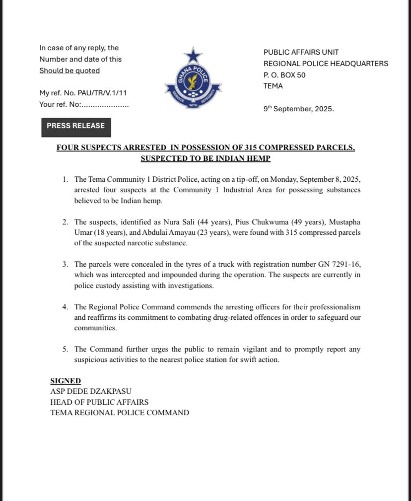Four individuals have been arrested by the Tema Community 1 District Police following a tip-off, in connection with the possession of substances believed to be Indian hemp.