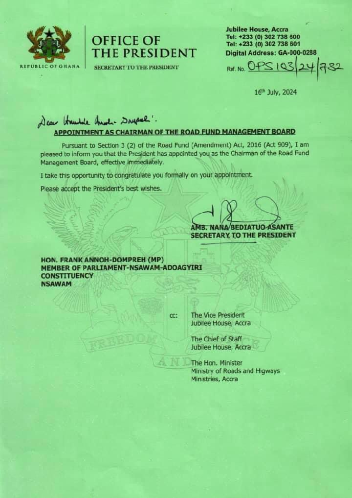 President Nana Akufo-Addo has appointed Frank Annoh-Dompreh, the Majority Chief Whip as the Board Chairman of the Road Fund Management.
