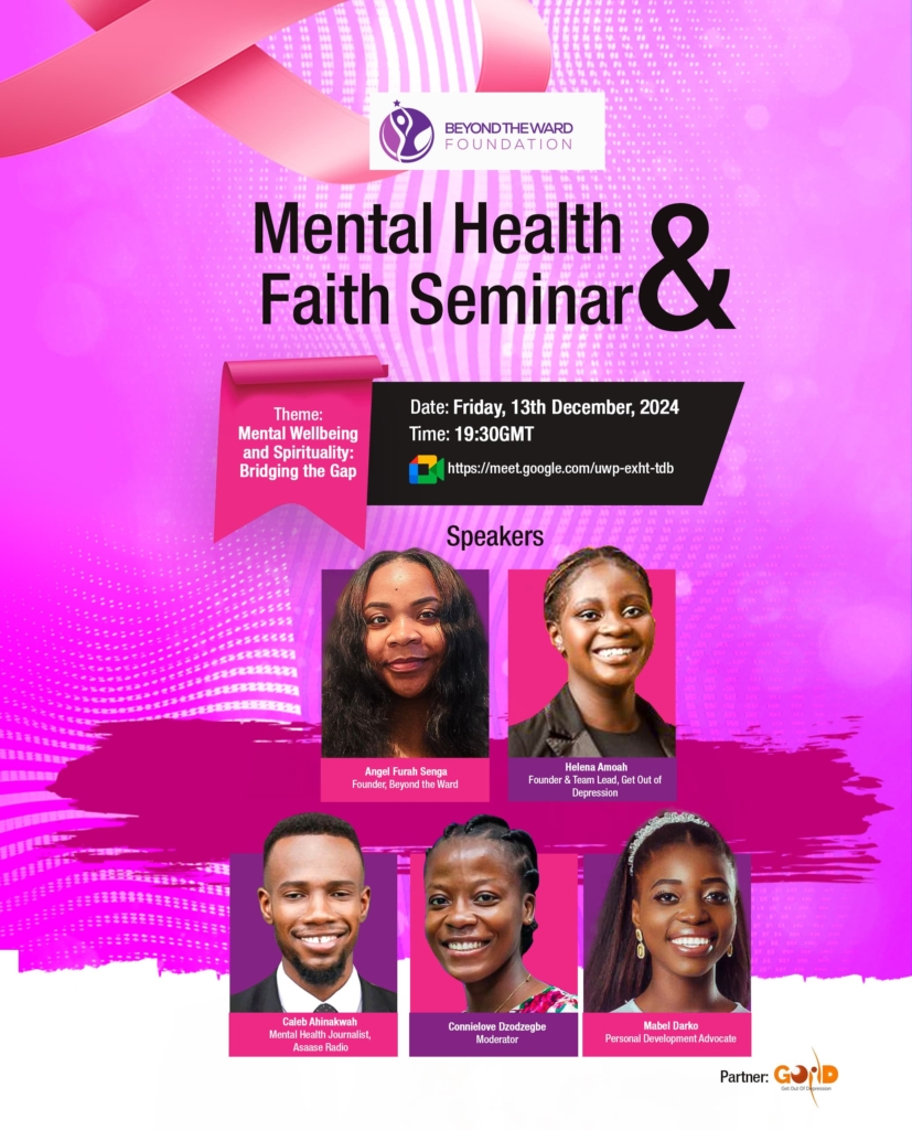 The free event, scheduled for Friday, December 13, 2024, at 19:30 GMT, will feature insights from notable speakers including Beyond The Ward founder, Angel Furah Senga, Founder and Team Lead, Get Out Of Depression Foundation (G.O.O.D) Helena Amoah, Personal Development Advocate, Mabel Darko, and Mental Health journalist with Ghana-based Asaase Radio, Caleb Ahinakwah.