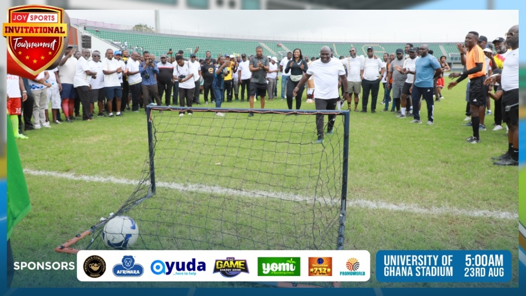 Chief of Staff Julius Debrah set the tone for the highly anticipated CEO’s Penalty Shootout at the 2025 JoySports Invitational Tournament, held at the University of Ghana Stadium on Saturday, August 23.