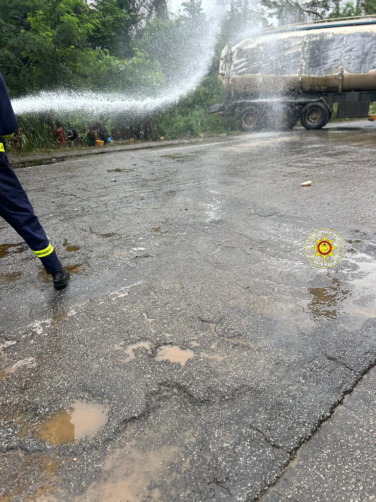 According to a post shared on Facebook by the Ghana National Fire Service (GNFS), the incident occurred on Wednesday, 8 April 2026, at about 9:12 a.m, near the Pra River, when a DAF XF tanker transporting 45,000 litres of diesel suffered damage to its bulk.