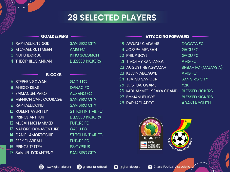 Twenty-eight (28) players have been called up by Ghana's head coach Philip Boakye to begin camping ahead of the 2024 Futsal Africa Cup of Nations.