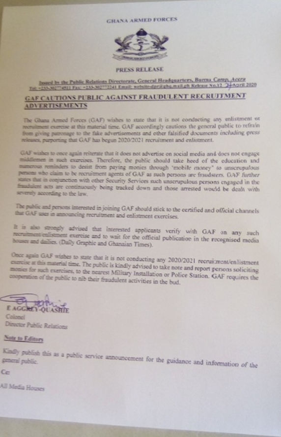 The Ghana Armed Forces (GAF) has cautioned the public to desist from spreading fake recruitment advertisements on social media.