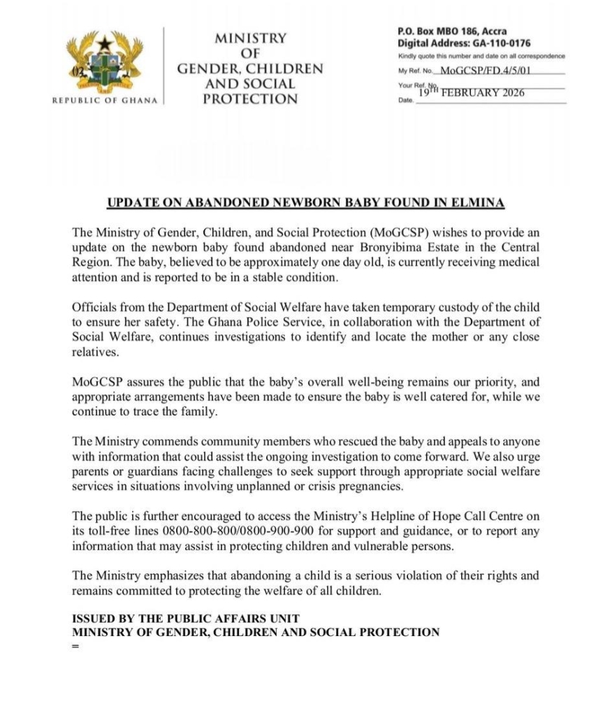 She reiterated that abandoning a child is a violation of their rights and assured Ghanaians that appropriate care arrangements have been made for the newborn while investigations continue.