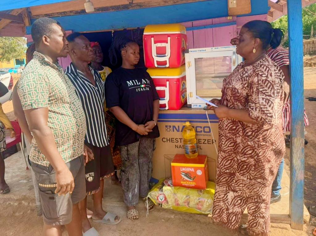 The support package was presented in Akim Oda, Eastern Region, and includes a deep freezer, ice chests, food items, a glass display case for her fried yam and fish business, and cash support to help her establish and sustain her livelihood.