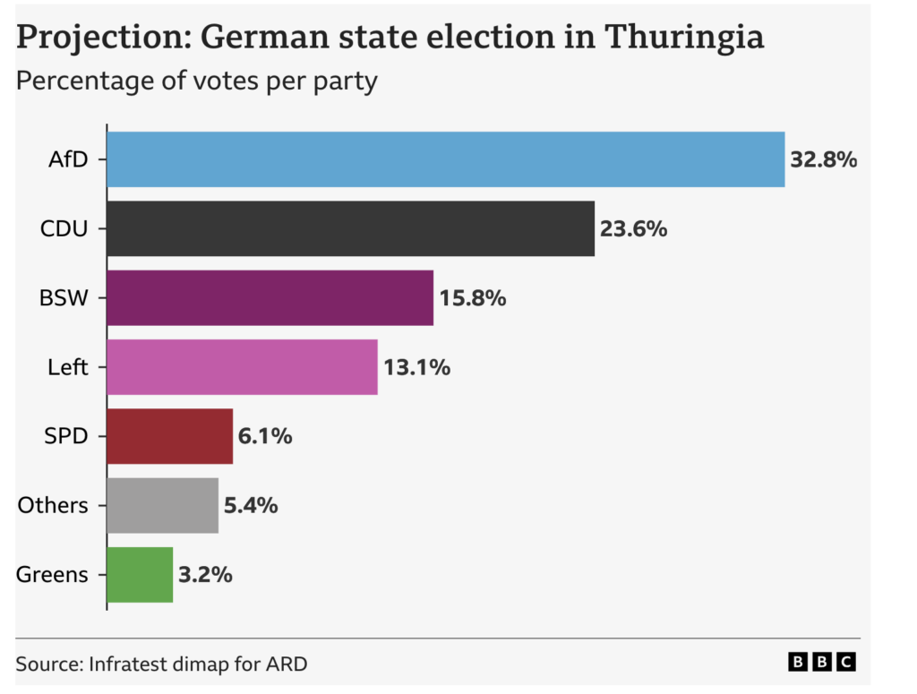 If the projections are confirmed, the AfD is on course to win 32 seats in the 88-seat Thuringia state parliament, and the CDU 23 seats, with only one of the three parties in the national government represented.