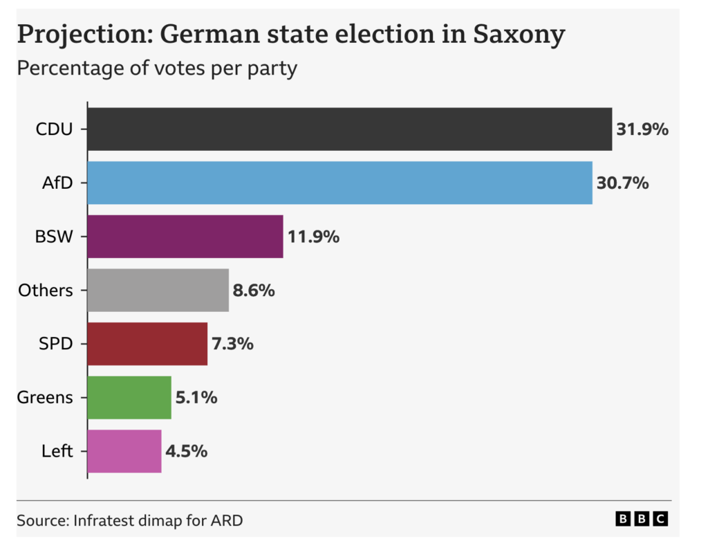 In Saxony, the conservatives are on course to win 42 seats, just ahead of the AfD with 40, while Sahra Wagenknecht's party is in third with 15 seats.