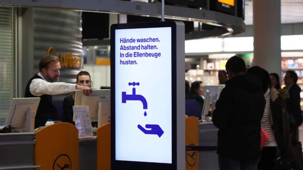 Munich airport: The sign reads "Wash your hands, keep a distance, cough into your elbow."