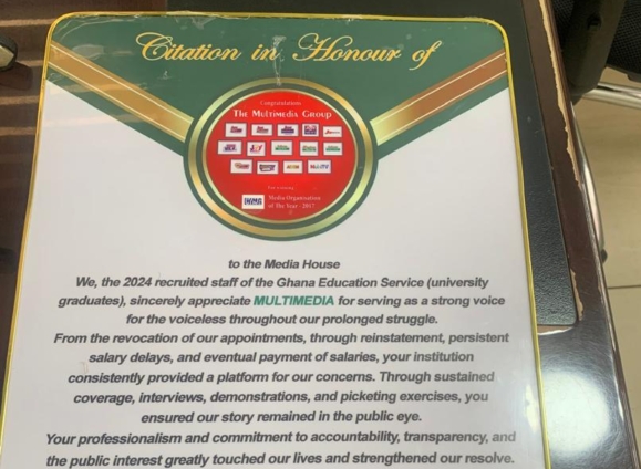 In a citation presented to the media organisation, the teachers commended Multimedia for serving as a strong voice for the voiceless throughout the period when their appointments were revoked, later reinstated, and salaries delayed before eventual payment.